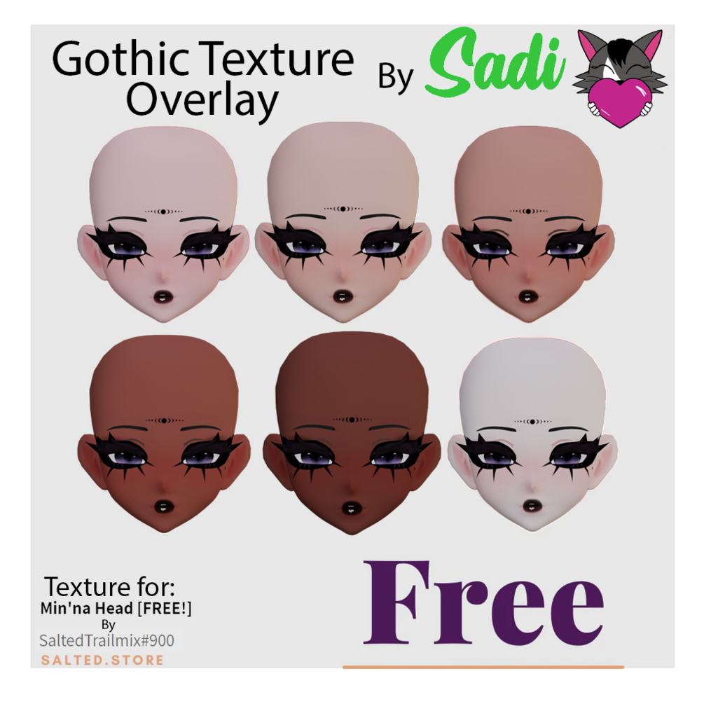 Credit myself for the face texture (Sadi#0001) with link back to my gumroad (may use a hyperlink) https://sadienna.gumroad.com/l/GothicSaltedTexture